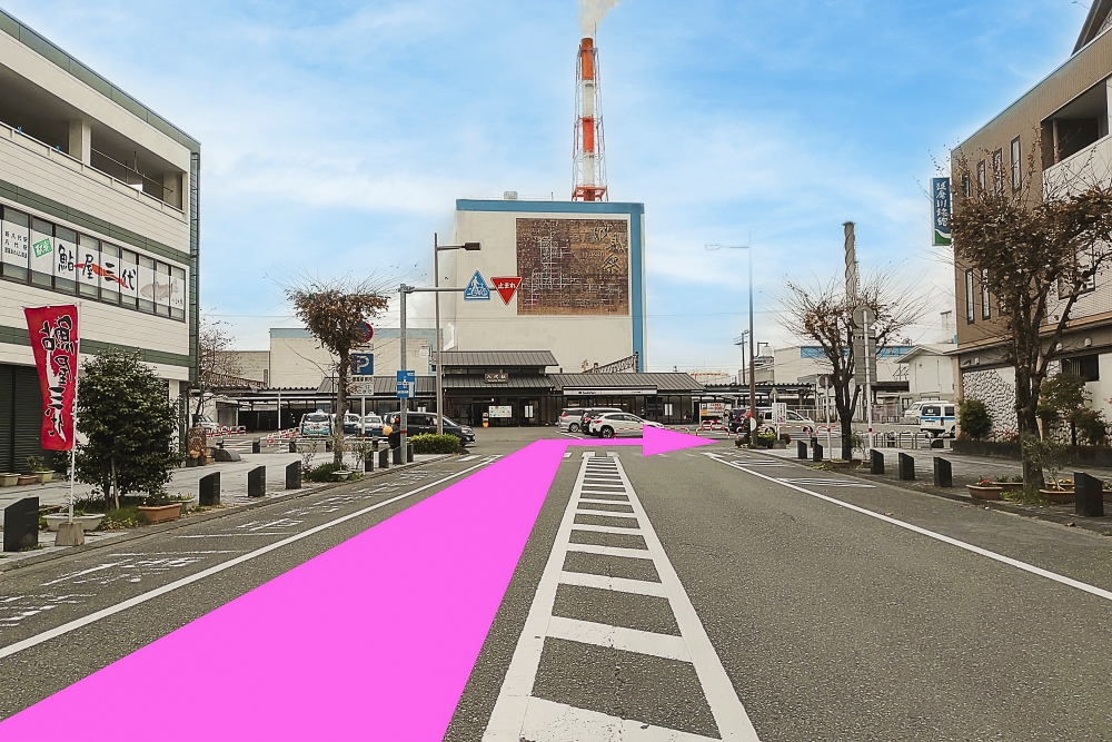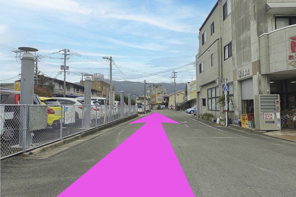JR八代駅に突き当り右に真っすぐ100m程お進みください。